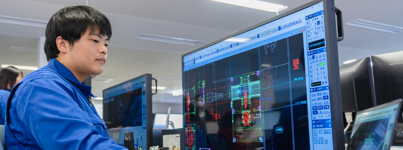 入社当初は当然、機械の用語などもまったく知らない状態だったので、まずは組み立ての現場で学ぶことになりました。自分だけついていけなかったらどうしようか…という不安はありましたが、私と同じように機械を専攻してこなかった同期もいたため、スタートラインは横並びの状態でエヌテックのモノづくりを一通り学ばせてもらいました。その後に念願の設計部に配属されることになるのですが、組み立ての現場で実際に製品として完成されていく工程を、実務を通して経験できたことはよかったと思います。特に、お客様先に据え付けされて稼働する様子を見ることができたのは、エヌテックの仕事の価値を感じることのできた瞬間でした。設計部では図面の作成がメインになるので、お客様先に出向いて据え付け作業をすることはないのですが、自分の作成した図面がお客様のもとに製品となって届くということを実体験として理解できたことは大きかったですね。